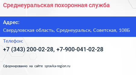 Среднеуральская похоронная служба по адресу Свердловская область, Среднеуральск, Советская, 108Б в дальнейшем Организация, размещена в следующих категориях: