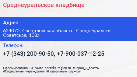Среднеуральское кладбище по адресу 624070, Свердловская область, Среднеуральск, Советская, 108а в дальнейшем Организация, размещена в следующих категориях: