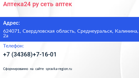 Аптека24.ру, сеть аптек по адресу 624071, Свердловская область, Среднеуральск, Калинина, 2а в дальнейшем Организация, размещена в следующих категориях: