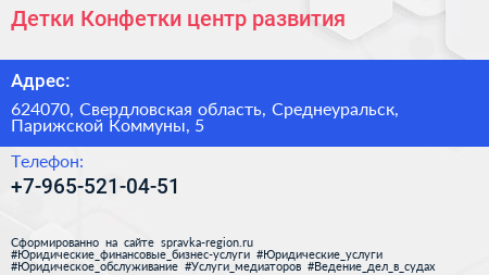 Детки-Конфетки, центр развития по адресу 624070, Свердловская область, Среднеуральск, Парижской Коммуны, 5 в дальнейшем Организация, размещена в следующих категориях: