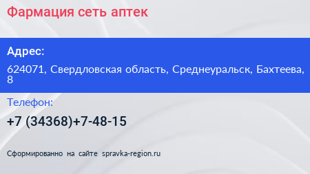 Фармация, сеть аптек по адресу 624071, Свердловская область, Среднеуральск, Бахтеева, 8 в дальнейшем Организация, размещена в следующих категориях: