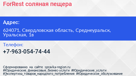 ForRest, соляная пещера по адресу 624071, Свердловская область, Среднеуральск, Уральская, 1в в дальнейшем Организация, размещена в следующих категориях: