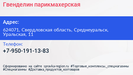 Гвенделин, парикмахерская по адресу 624071, Свердловская область, Среднеуральск, Уральская, 11 в дальнейшем Организация, размещена в следующих категориях: