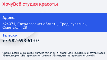 #ХочуВсё, студия красоты по адресу 624071, Свердловская область, Среднеуральск, Советская, 28 в дальнейшем Организация, размещена в следующих категориях:
