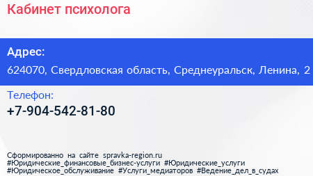 Кабинет психолога по адресу 624070, Свердловская область, Среднеуральск, Ленина, 2 в дальнейшем Организация, размещена в следующих категориях: