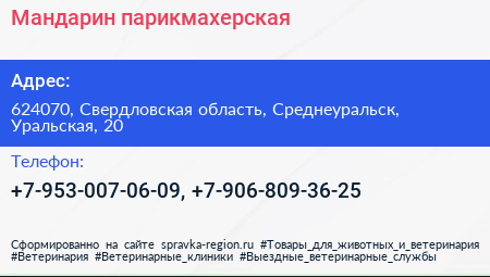 Мандарин, парикмахерская по адресу 624070, Свердловская область, Среднеуральск, Уральская, 20 в дальнейшем Организация, размещена в следующих категориях: