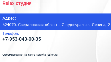 Relax, студия по адресу 624070, Свердловская область, Среднеуральск, Ленина, 2 в дальнейшем Организация, размещена в следующих категориях: