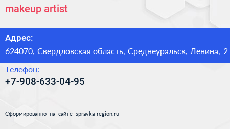 makeup artist по адресу 624070, Свердловская область, Среднеуральск, Ленина, 2 в дальнейшем Организация, размещена в следующих категориях:
