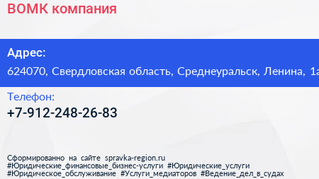 ВОМК, компания по адресу 624070, Свердловская область, Среднеуральск, Ленина, 1а в дальнейшем Организация, размещена в следующих категориях: