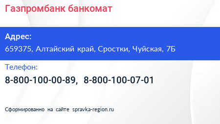 Газпромбанк, банкомат по адресу 659375, Алтайский край, Сростки, Чуйская, 7Б в дальнейшем Организация, размещена в следующих категориях:
