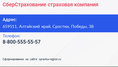 СберСтрахование, страховая компания по адресу 659511, Алтайский край, Сростки, Победы, 38 в дальнейшем Организация, размещена в следующих категориях: