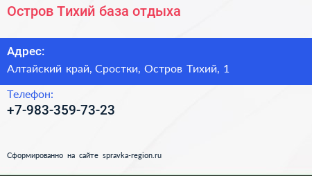 Остров Тихий, база отдыха по адресу Алтайский край, Сростки, Остров Тихий, 1 в дальнейшем Организация, размещена в следующих категориях: