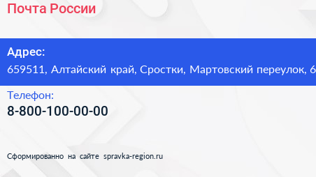 Почта России по адресу 659511, Алтайский край, Сростки, Мартовский переулок, 6 в дальнейшем Организация, размещена в следующих категориях: