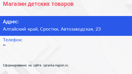 Магазин детских товаров по адресу Алтайский край, Сростки, Автозаводская, 23 в дальнейшем Организация, размещена в следующих категориях: