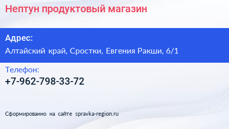 Нептун, продуктовый магазин по адресу Алтайский край, Сростки, Евгения Ракши, 6/1 в дальнейшем Организация, размещена в следующих категориях: