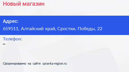 Новый, магазин по адресу 659511, Алтайский край, Сростки, Победы, 22 в дальнейшем Организация, размещена в следующих категориях: