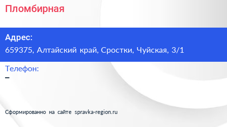 Пломбирная по адресу 659375, Алтайский край, Сростки, Чуйская, 3/1 в дальнейшем Организация, размещена в следующих категориях: