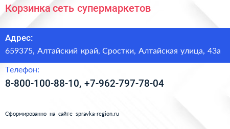 Корзинка, сеть супермаркетов по адресу 659375, Алтайский край, Сростки, Алтайская улица, 43а в дальнейшем Организация, размещена в следующих категориях: