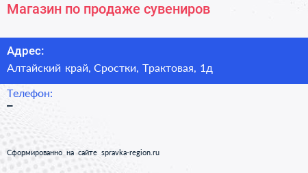 Магазин по продаже сувениров по адресу Алтайский край, Сростки, Трактовая, 1д в дальнейшем Организация, размещена в следующих категориях: