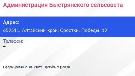 Администрация Быстрянского сельсовета по адресу 659511, Алтайский край, Сростки, Победы, 19 в дальнейшем Организация, размещена в следующих категориях: