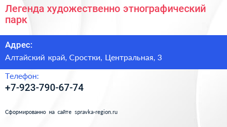 Легенда, художественно-этнографический парк по адресу Алтайский край, Сростки, Центральная, 3 в дальнейшем Организация, размещена в следующих категориях: