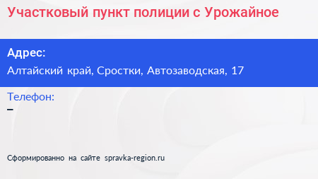 Участковый пункт полиции, с. Урожайное по адресу Алтайский край, Сростки, Автозаводская, 17 в дальнейшем Организация, размещена в следующих категориях: