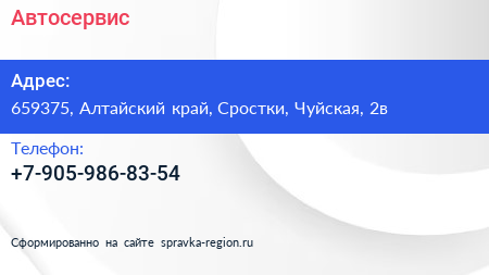 Автосервис по адресу 659375, Алтайский край, Сростки, Чуйская, 2в в дальнейшем Организация, размещена в следующих категориях: