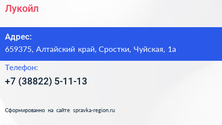 Лукойл по адресу 659375, Алтайский край, Сростки, Чуйская, 1а в дальнейшем Организация, размещена в следующих категориях: