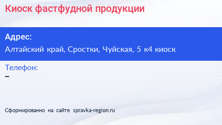 Киоск фастфудной продукции по адресу Алтайский край, Сростки, Чуйская, 5 к4 киоск в дальнейшем Организация, размещена в следующих категориях: