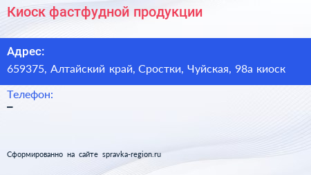 Киоск фастфудной продукции по адресу 659375, Алтайский край, Сростки, Чуйская, 98а киоск в дальнейшем Организация, размещена в следующих категориях: