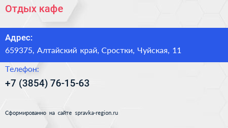 Отдых, кафе по адресу 659375, Алтайский край, Сростки, Чуйская, 11 в дальнейшем Организация, размещена в следующих категориях: