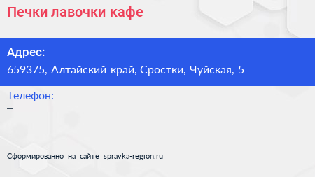 Печки лавочки, кафе по адресу 659375, Алтайский край, Сростки, Чуйская, 5 в дальнейшем Организация, размещена в следующих категориях: