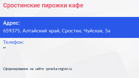 Сростинские пирожки, кафе по адресу 659375, Алтайский край, Сростки, Чуйская, 5а в дальнейшем Организация, размещена в следующих категориях: