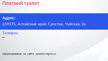 Платный туалет по адресу 659375, Алтайский край, Сростки, Чуйская, 2а в дальнейшем Организация, размещена в следующих категориях:
