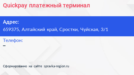 Quickpay, платежный терминал по адресу 659375, Алтайский край, Сростки, Чуйская, 3/1 в дальнейшем Организация, размещена в следующих категориях: