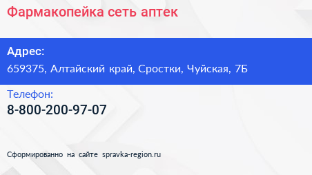 Фармакопейка, сеть аптек по адресу 659375, Алтайский край, Сростки, Чуйская, 7Б в дальнейшем Организация, размещена в следующих категориях: