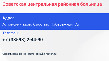 Советская центральная районная больница по адресу Алтайский край, Сростки, Набережная, 9а в дальнейшем Организация, размещена в следующих категориях: