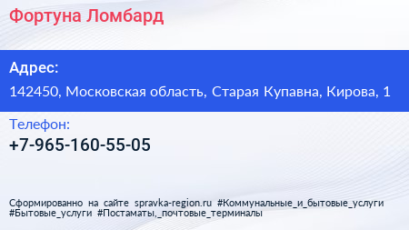 Фортуна Ломбард по адресу 142450, Московская область, Старая Купавна, Кирова, 1 в дальнейшем Организация, размещена в следующих категориях: