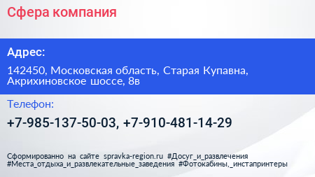 Сфера, компания по адресу 142450, Московская область, Старая Купавна, Акрихиновское шоссе, 8в в дальнейшем Организация, размещена в следующих категориях: