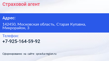 Страховой агент по адресу 142450, Московская область, Старая Купавна, Микрорайон, 3 в дальнейшем Организация, размещена в следующих категориях: