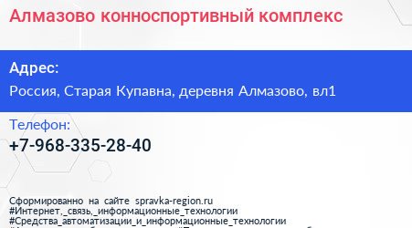 Алмазово, конноспортивный комплекс по адресу Конно-спортивный клуб Алмазово, Большие Жеребцы - Алмазово, Большие Жеребцы, городской округ Щёлково, Московская область, Центральный федеральный округ, 141103, Россия в дальнейшем Организация, размещена в следующих категориях:
