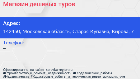 Магазин дешевых туров по адресу 142450, Московская область, Старая Купавна, Кирова, 7 в дальнейшем Организация, размещена в следующих категориях: