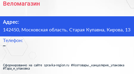 Веломагазин по адресу 142450, Московская область, Старая Купавна, Кирова, 13 в дальнейшем Организация, размещена в следующих категориях: