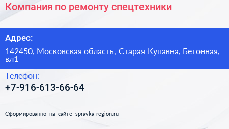Компания по ремонту спецтехники по адресу 142450, Московская область, Старая Купавна, Бетонная, вл1 в дальнейшем Организация, размещена в следующих категориях: