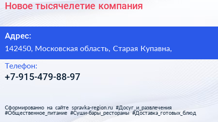 Новое тысячелетие, компания по адресу 142450, Московская область, Старая Купавна, в дальнейшем Организация, размещена в следующих категориях: