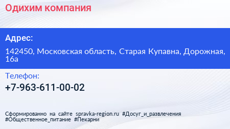 Одихим, компания по адресу 142450, Московская область, Старая Купавна, Дорожная, 16а в дальнейшем Организация, размещена в следующих категориях: