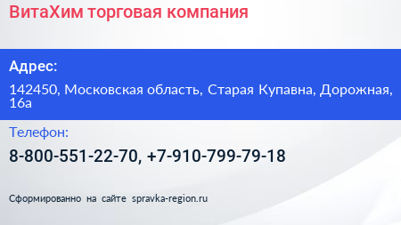 ВитаХим, торговая компания по адресу 142450, Московская область, Старая Купавна, Дорожная, 16а в дальнейшем Организация, размещена в следующих категориях: