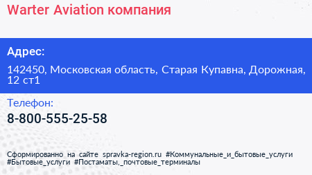 Warter Aviation, компания по адресу 142450, Московская область, Старая Купавна, Дорожная, 12 ст1 в дальнейшем Организация, размещена в следующих категориях: