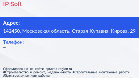 IP Soft по адресу 142450, Московская область, Старая Купавна, Кирова, 29 в дальнейшем Организация, размещена в следующих категориях: