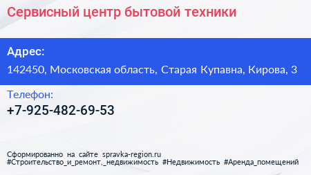 Сервисный центр бытовой техники по адресу 142450, Московская область, Старая Купавна, Кирова, 3 в дальнейшем Организация, размещена в следующих категориях: